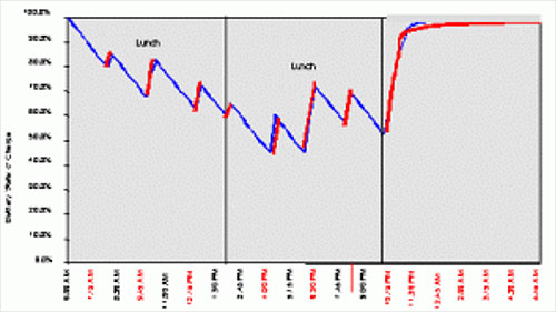 This chart shows a common 2-shift operation with two breaks and lunches and one shift change. As you can see, the truck’s state of charge stays between 40% and 100% throughout the day without ever making a battery change.